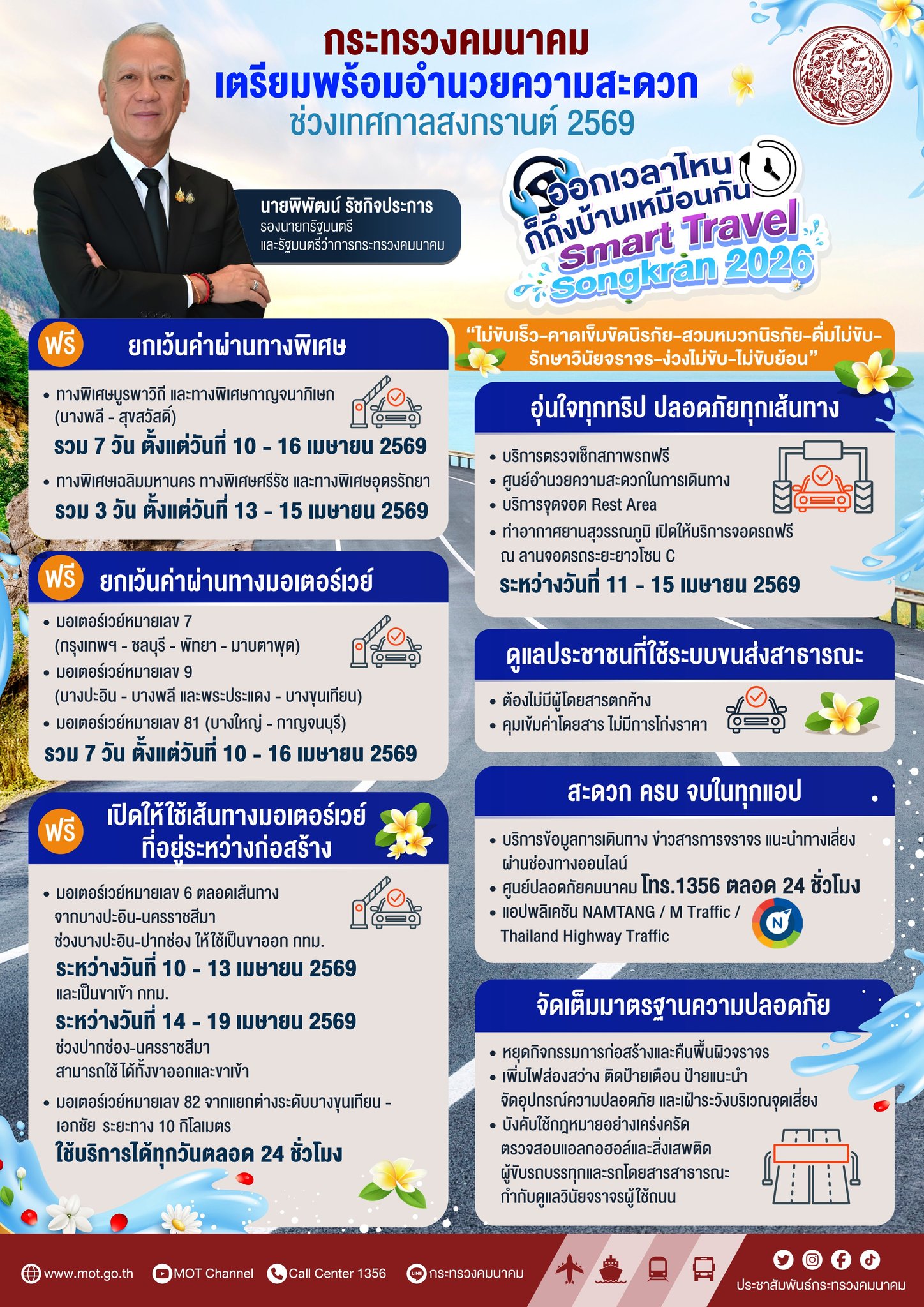 วันที่ 1 เมษายน 2569 นายพิพัฒน์ รัชกิจประการ รองนายกรัฐมนตรีและรัฐมนตรีว่าการกระทรวงคมนาคม สั่งการหน่วยงานในสังกัดบูรณาการแผนการอำนวยความสะดวกและปลอดภัยรองรับการเดินทางของประชาชนในช่วงเทศกาลสงกรานต์ 2569 ระหว่างวันที่ 10 – 19 เมษายน 2569 ภายใต้แคมเปญรณรงค์ “ออกเวลาไหนก็ถึงบ้านเหมือนกัน Smart Travel Songkran 2569” โดยตั้งเป้าลดอุบัติเหตุ ผู้เสียชีวิต และผู้บาดเจ็บลงให้ได้ไม่น้อยกว่า 5%