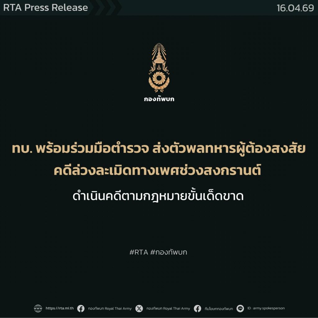 กองทัพบก ได้ตรวจสอบข้อมูลดังกล่าวแล้ว พบว่ากองทัพภาคที่ 1 ได้รับการประสานจากสถานีตำรวจนครบาลชนะสงคราม เพื่อติดตามตัวผู้ต้องสงสัย ซึ่งคาดว่าเป็นทหารกองประจำการในสังกัด จากกรณีเหตุการณ์ล่วงละเมิดทางเพศ เมื่อคืนวันที่ 14 เมษายน 2569 บริเวณถนนตานี ใกล้กับถนนข้าวสาร เขตพระนคร กรุงเทพมหานคร