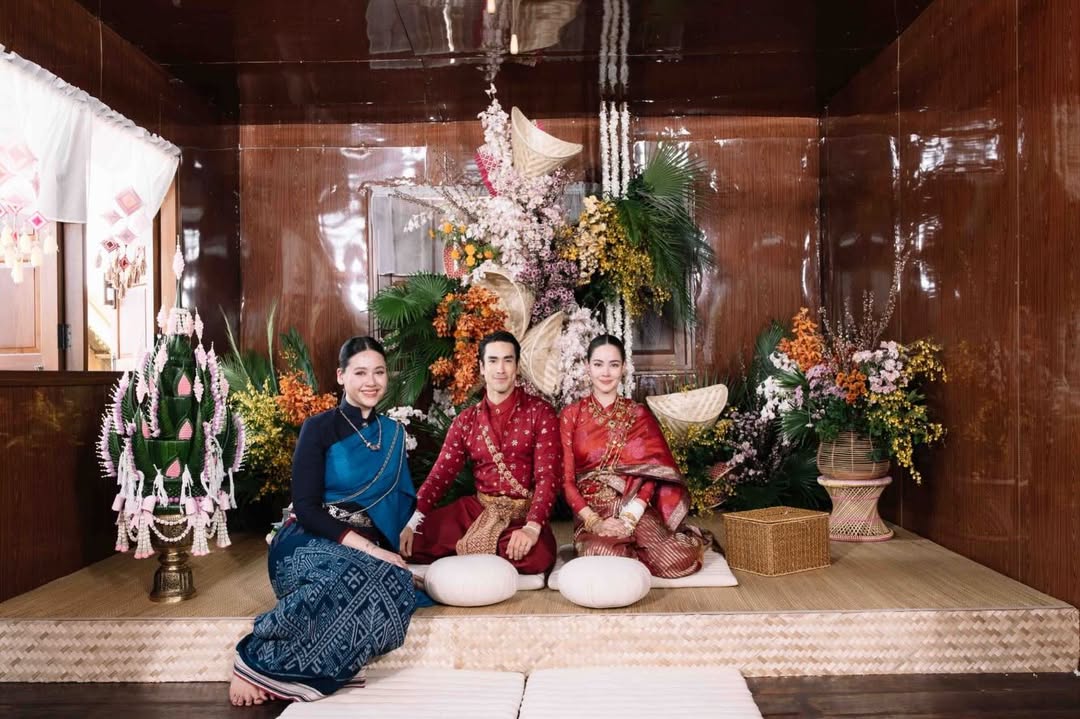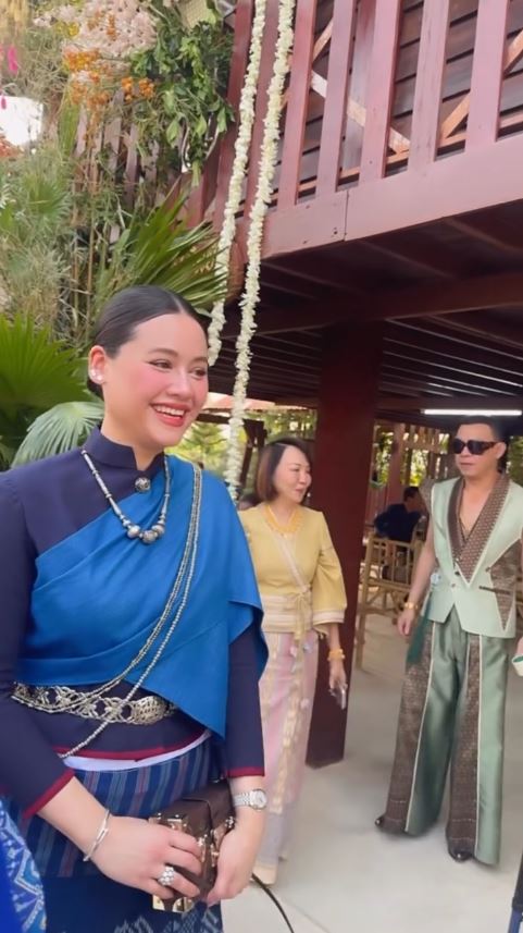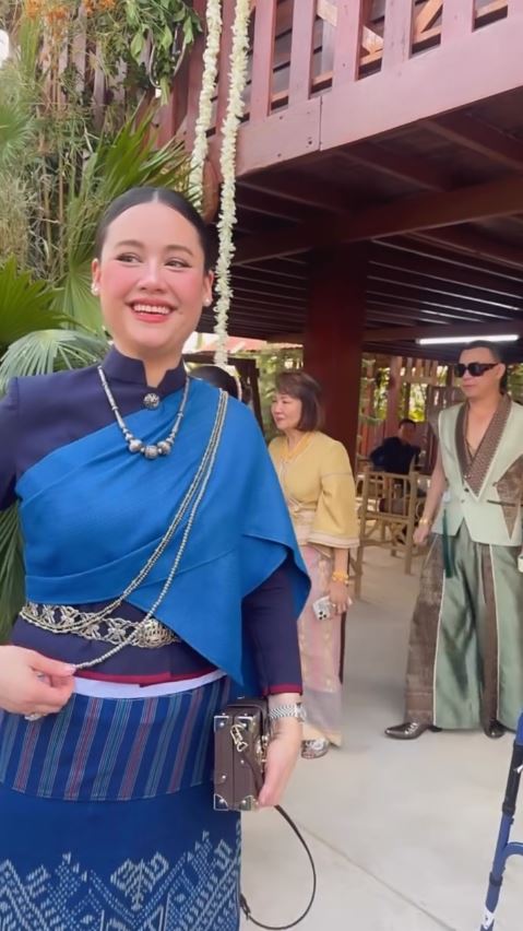 ฝั่งเพื่อน ๆ ก็แต่งชุดไทยกันมาแบบจัดเต็ม สีสันสวยทั้งงาน แต่ที่ทำเอาหลายคนสะดุดตาและถูกจับตามองเป็นพิเศษคือ แคท เสปอร์บันด์ พี่สาวแท้ ๆ ของสาวญาญ่า ที่ปรากฏตัวในชุดไทยห่มสไบสีน้ำเงินเข้ม ลุคเรียบร้อยดูหวานละมุน