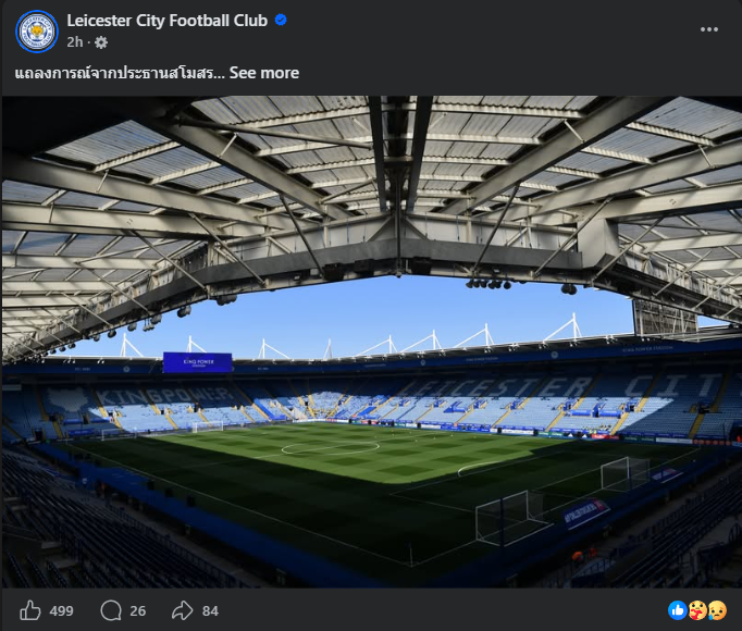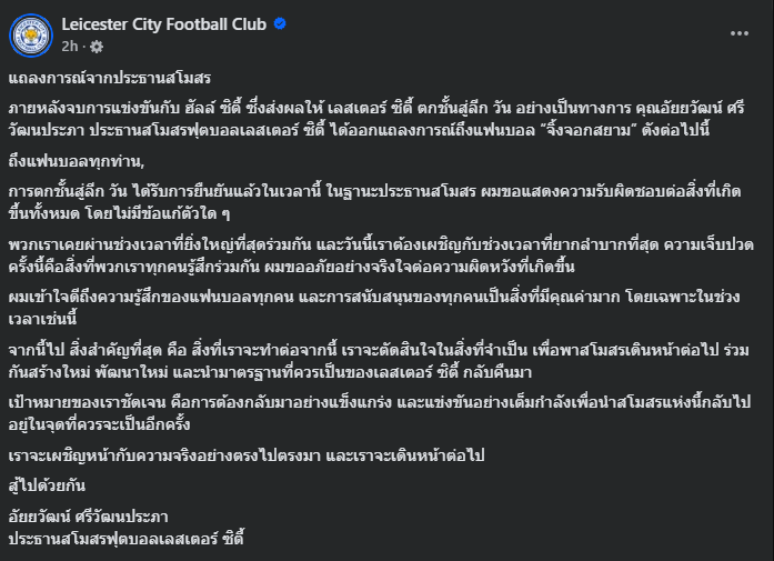โดยแถลงการณ์ของสโมสรเลสเตอร์ ซิตี้ ที่ส่งสารถึงแฟนบอล มีใจความว่า