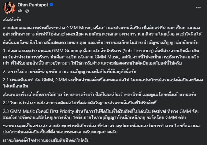 ล่าสุด เฟซบุ๊กเพจ GMM Grammy ได้โพสต์ถ้อยแถลงความร่วมมือในการบริหารจัดการศิลปินระหว่างบริษัท จีเอ็มเอ็ม มิวสิค จำกัด (มหาชน), บริษัท ครึ่งเก้า จำกัด และ ตัวแทนศิลปิน