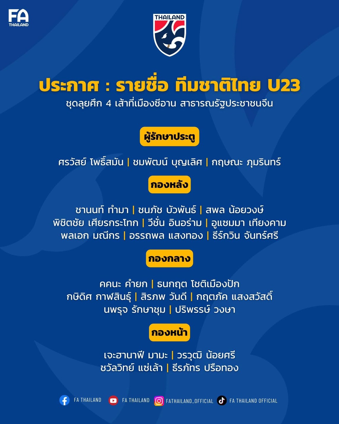 “ช้างศึก” U23 ประกาศรายชื่อ 23 แข้ง ลุยศึก 4 เส้าที่จีน