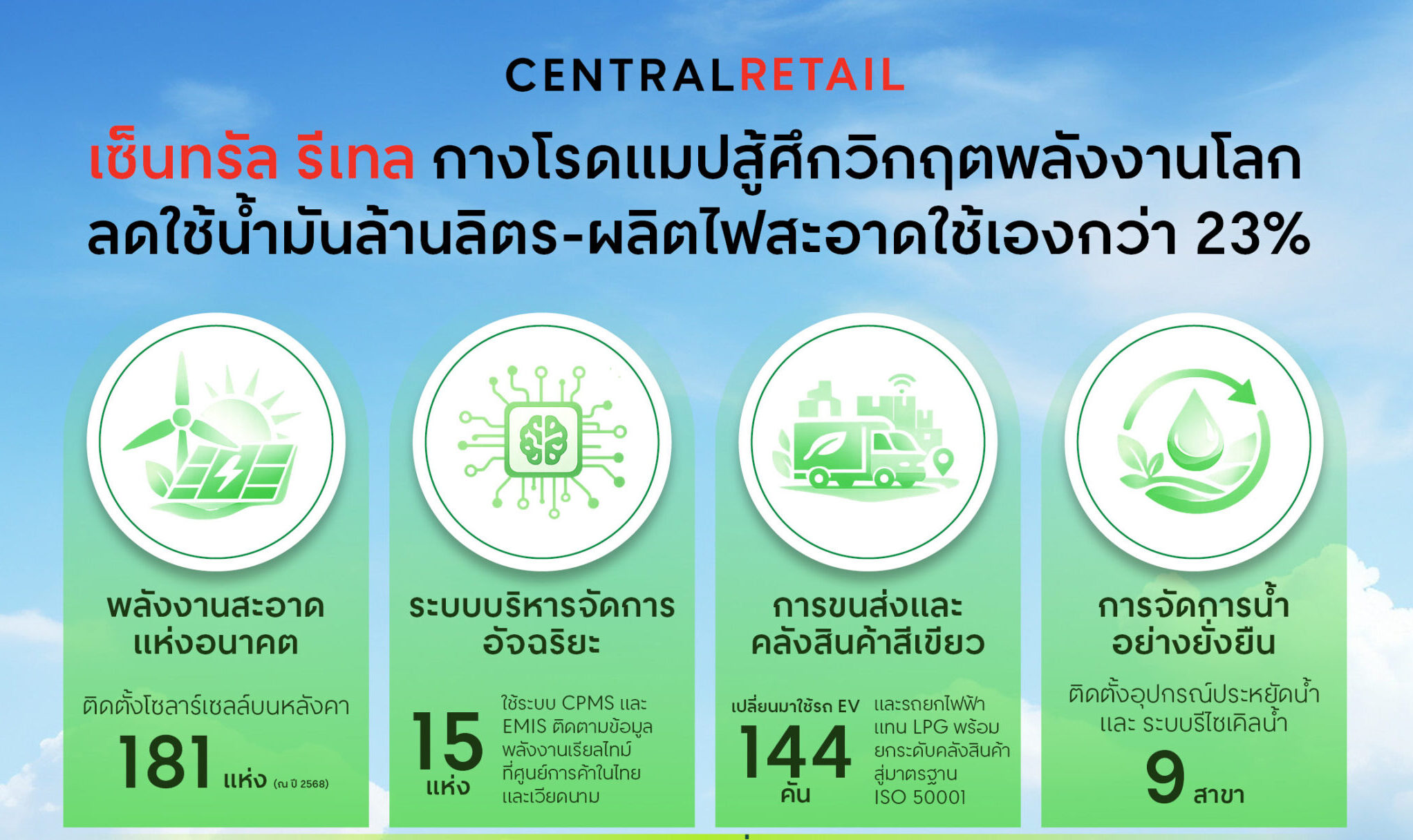 เซ็นทรัล รีเทล กางโรดแมปสู้ศึกวิกฤตพลังงานโลก ลดใช้น้ำมันล้านลิตร-ผลิตไฟสะอาดใช้เองกว่า 23% พร้อมดูแลลูกค้า-คู่ค้าอย่างยั่งยืน